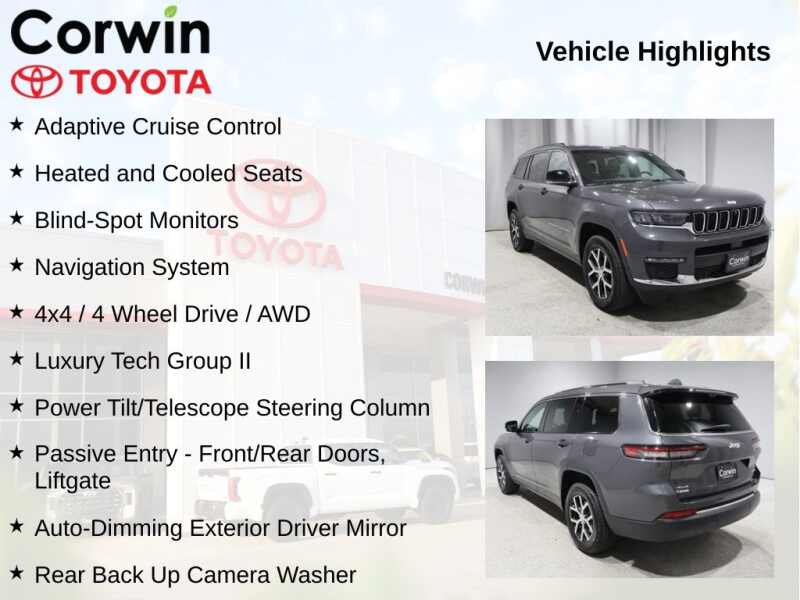 This Jeep Grand Cherokee L is well equipped and includes the following features and benefits, Adaptive Cruise Control, Heated and Cooled Seats, Blind-Spot Monitors, Navigation System, 4x4 / 4 Wheel Drive / AWD, 2nd Row Manual Window Shades, Auto-Dimming Exterior Driver Mirror, Capri Leatherette w/Axis II Seats, Integrated Off-Road Camera, Intersection Collision Assist System, Luxury Tech Group II, Memory Steering Column, ParkSense Front/Rear Park Assist w/Stop, Passive Entry - Front/Rear Doors, Liftgate, Power Tilt/Telescope Steering Column, Rain Sensitive Windshield Wipers, Rear Back Up Camera Washer, Rearview Autodim Digital Display Mirror, Surround View Camera System, Ventilated Front Seats, Wireless Charging Pad.