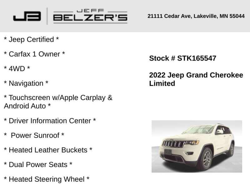 * Jeep Certified * Carfax 1 Owner * 4WD * 8.4-Inch Navigation Touchscreen w/Apple Carplay & Android Auto * Driver Information Center * Power Sunroof * Heated Leather Buckets * Dual Power Seats * Heated Steering Wheel * Blind Spot * Rear Cross Path Detection * Bluetooth Hands Free * Cruise Control * Remote Start * 18 Inch Alloy Wheels * LED Tail Lamps * Keyless Enter-n-Go * Power Liftgate * Dual-Zone Automatic Climate Control * Rear Camera * Satellite Radio *