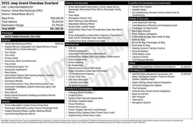 WELCOME TO DECEMBER AT CORWIN CHRYSLER DODGE JEEP RAM OF FARGO!! WE HAVE GREAT SAVINGS ON ALL OF OUR PRE-OWNED VEHICLES AVAILABLE!! WE HAVE ONE OF THE LARGEST SELECTIONS OF INVENTORIES IN OUR AREA AT ONE SINGLE LOCATION!! Velvet Red Pearlcoat 2022 Jeep Grand Cherokee Overland FACTORY CERTIFIED 4D Sport Utility 4WD 3.6L V6 24V VVT Certified. CARFAX One-Owner.