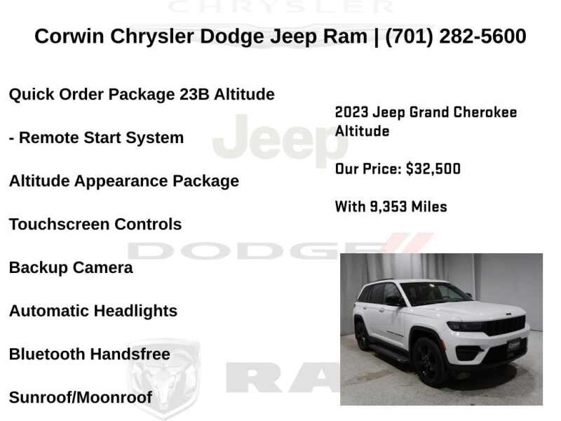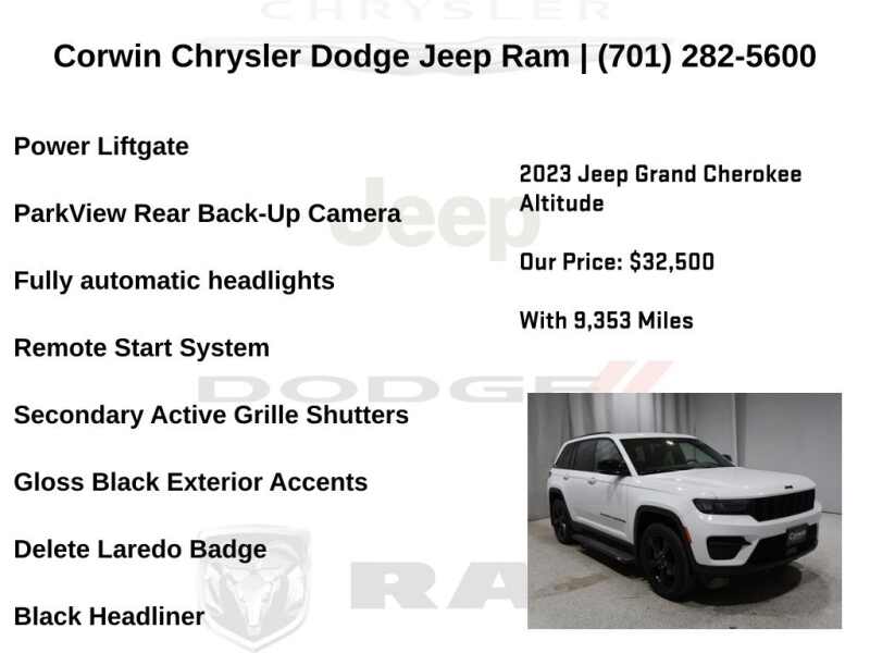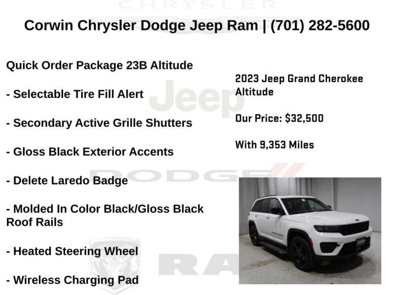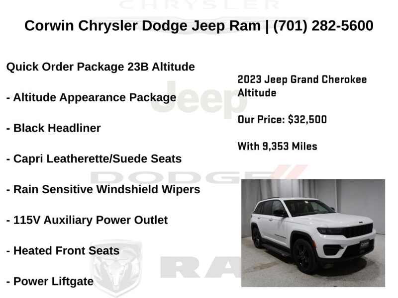 WELCOME TO DECEMBER AT CORWIN CHRYSLER DODGE JEEP RAM OF FARGO!! WE HAVE GREAT SAVINGS ON ALL OF OUR PRE-OWNED VEHICLES AVAILABLE!! WE HAVE ONE OF THE LARGEST SELECTION OF INVENTORIES IN OUR AREA AT ONE SINGLE LOCATION!! Priced below KBB Fair Purchase Price! Bright White Clearcoat 2023 Jeep Grand Cherokee Altitude FACTORY CERTIFIED 4D Sport Utility 4WD 3.6L V6 24V VVT Certified. CARFAX One-Owner.