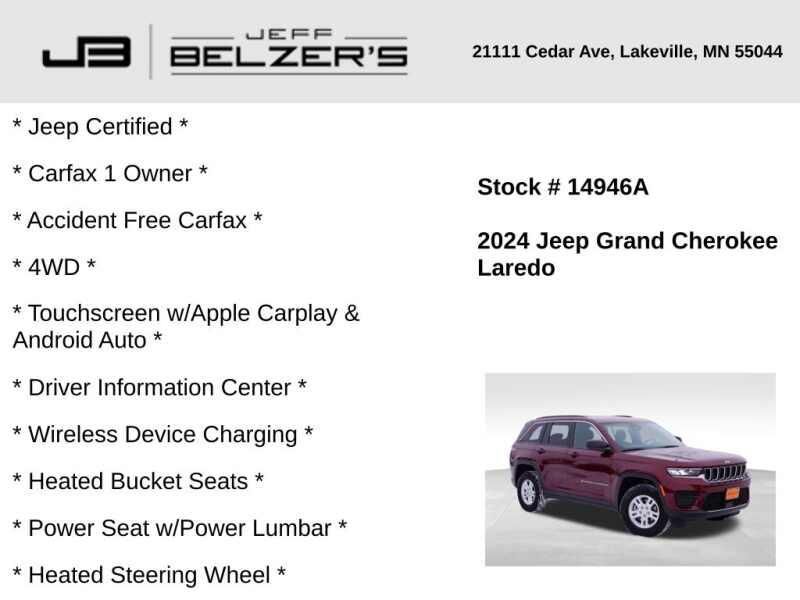 * Jeep Certified * Carfax 1 Owner * Accident Free Carfax * 4WD * 8.4-Inch Touchscreen w/Apple Carplay & Android Auto * 10.25-Inch Driver Information Center * Wireless Device Charging * Heated Bucket Seats * Power Seat w/Power Lumbar * Heated Steering Wheel * Blind Spot * Rear Cross Path Detection * Lane Departure Warning * Autonomous Emergency Braking * Full-Speed Forward Collision Warning * Lane Keep Assist * Bluetooth Hands Free * Cruise Control * Adaptive Cruise w/Stop & Go * Remote Keyless Entry * Remote Start * 18 Inch Alloy Wheels * LED Headlamps * Push Button Start * Power Liftgate * Rear Park Assist * Dual-Zone Automatic Climate Control * Rear Camera * Satellite Radio *
