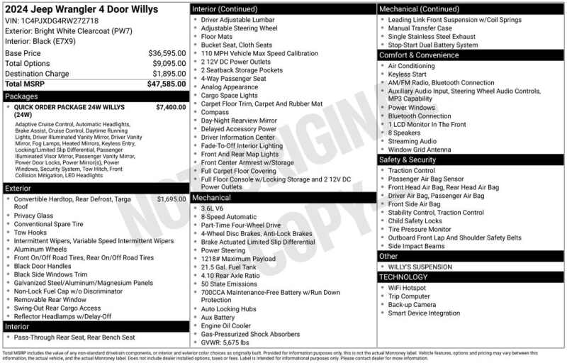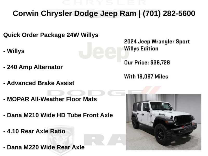 WELCOME TO DECEMBER AT CORWIN CHRYSLER DODGE JEEP RAM OF FARGO!! WE HAVE GREAT SAVINGS ON ALL OF OUR PRE-OWNED VEHICLES AVAILABLE!! WE HAVE ONE OF THE LARGEST SELECTION OF INVENTORIES IN OUR AREA AT ONE SINGLE LOCATION!! Priced below KBB Fair Purchase Price! Bright White Clearcoat 2024 Jeep Wrangler Willys FACTORY CERTIFIED 4D Sport Utility 4WD 3.6L V6 24V VVT Certified.