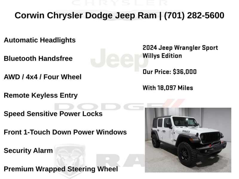 DECEMBER IS HERE AT CORWIN CHRYSLER DODGE JEEP RAM OF FARGO!! WE HAVE STOCKINGS FULL OF SAVINGS ON ALL OF OUR PRE-OWNED VEHICLES AVAILABLE!! WE HAVE ONE OF THE LARGEST SELECTION OF INVENTORIES IN OUR AREA AT ONE SINGLE LOCATION!! Priced below KBB Fair Purchase Price! Bright White Clearcoat 2024 Jeep Wrangler Willys FACTORY CERTIFIED 4D Sport Utility 4WD 3.6L V6 24V VVT Certified.