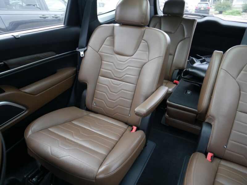 SX PRESTIGE PACKAGE Heated & Ventilated 2nd Row Seats, Premium Cloth Headliner & Pillar Trim, sun visors, 110V Inverter, Head Up Display, Rain-Sensing Front Windshield Wipers, NIGHTFALL EDITION PACKAGE Black Finish Radiator Grille, new Kia emblem, Front & Rear Gloss Black Finish Bumper Skid Plates, front bumper air duct garnish, Gloss Black Finish Front & Rear Door Garnish, Wheels 20 x 7.5 Exclusive Black Alloy, dark chrome lug nuts and black wheel caps, Exclusive Black Fog Light Bezel, Gloss Black Finish Exterior Emblems, Exclusive Black Headlight Bezels, Gloss Black Finish Roof Rails, Body Color Exterior Door Handles, TOWING PACKAGE Self Leveling Rear Suspension, Tow Hitch w/Harness (TOF). Kia SX with Black Copper exterior and Brown interior features a V6 Cylinder Engine with 291 HP at 6000 RPM*.