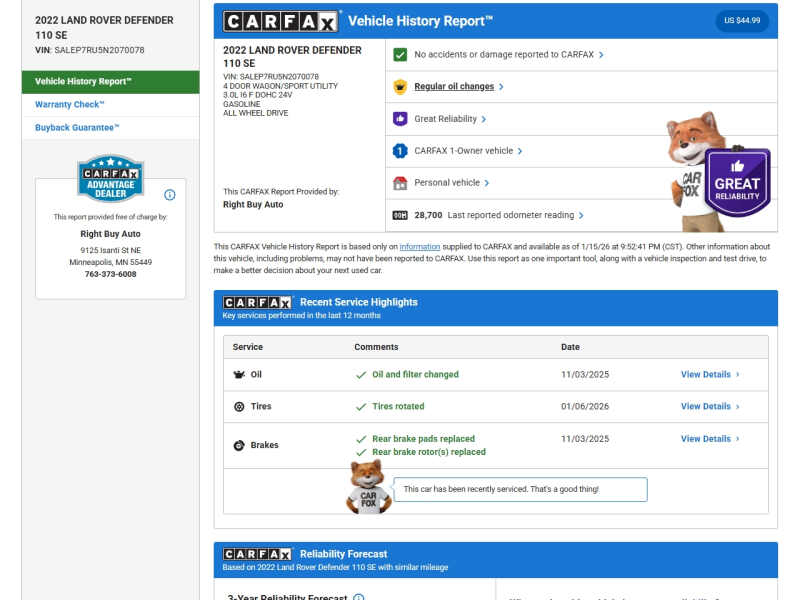 One Owner. Dealer maintained and serviced. Inspection performed. This Land Rover Defender 110 SE Features a 3.0L Turbo 6 Cylinder Engine 395HP/406TQ. 8 Speed Automatic Transmission. All Wheel Drive. 20 Wheels. 14 Way Heated Electric Seats w/Memory. 825W 15 Speaker Meridian Surround Sound System. 360 Parking Aid Front & Rear. Blind Spot Assist. Aerial View Camera System. Front & Rear Fog Lamps. Auto On/Off Projector Beam Headlamps. LED Brake Lights. Heated Steering Wheel. Panoramic Roof. Bluetooth Phone & Audio. Navigation System. Auto Dimming Mirrors. Android Auto & Apple CarPlay. Wireless Device Charging. Every Vehicle at Right Buy comes with a full inspection report. CarFax vehicle history report. Affordable extended coverage options and low-rate financing options. Set an appointment to view the vehicle in our heated indoor showroom. PRIME LEVEL 3 EXCLUSIONARY COVERAGE AVAILABLE 1 YEAR 12K MILES FOR $3,651 OR 4 YEAR 100K MILES FOR $4,702 OTHER TERMS AVAILABLE.