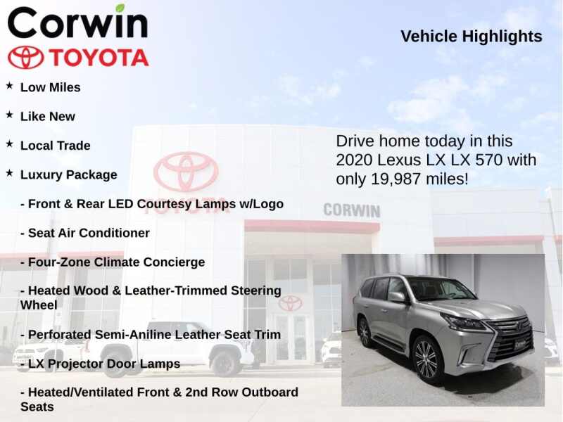 This Lexus LX is well equipped and includes the following features and benefits, Low Miles, Like New, Local Trade, Four-Zone Climate Concierge, Front & Rear LED Courtesy Lamps w/Logo, Heated Wood & Leather-Trimmed Steering Wheel, Heated/Ventilated Front & 2nd Row Outboard Seats, Luxury Package, LX Projector Door Lamps, Perforated Semi-Aniline Leather Seat Trim, Radio Mark Levinson Audio System, Seat Air Conditioner, Wheels 21 x 8.5 Split-10-Spoke J Aluminum Alloy.