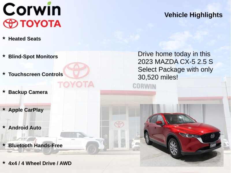 Priced below KBB Fair Purchase Price! 2023 Soul Red Crystal Metallic Mazda CX-5 2.5 S Select Package CARFAX One-Owner. Clean CARFAX.