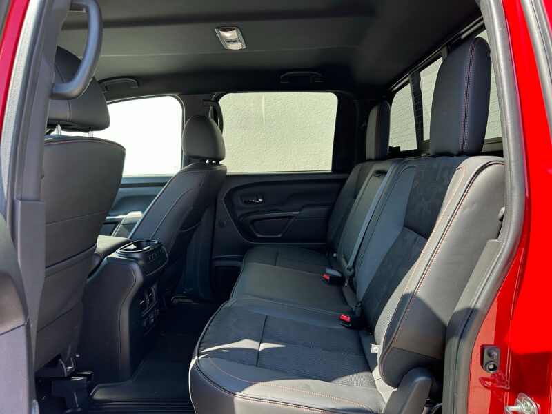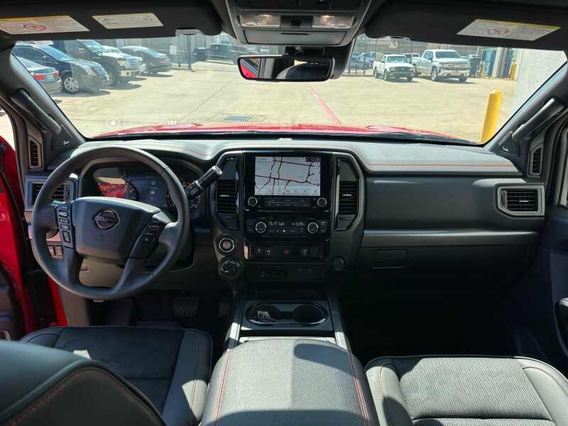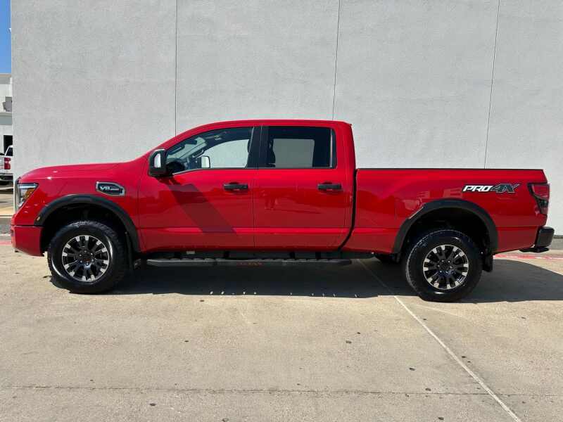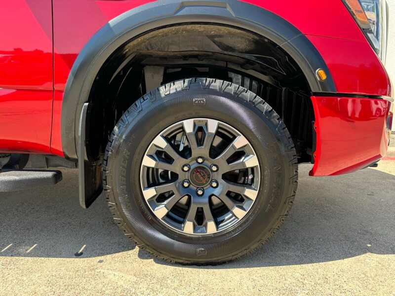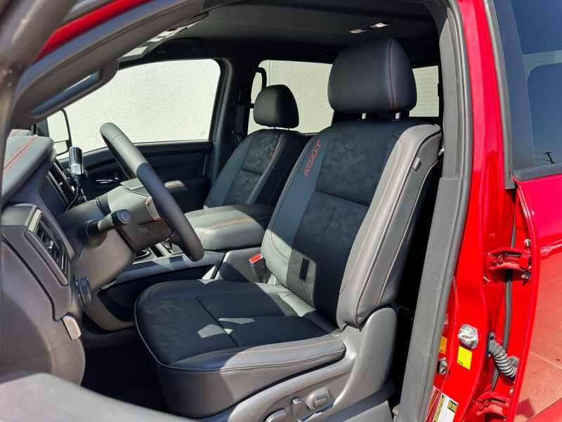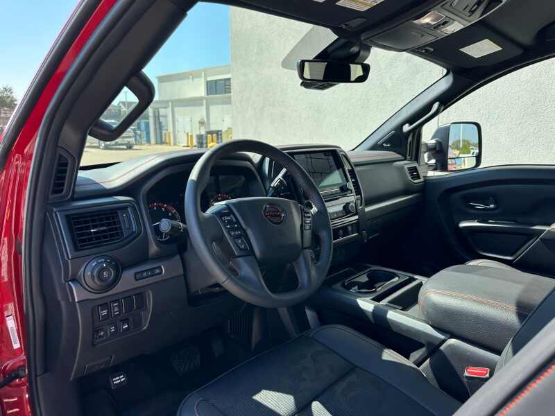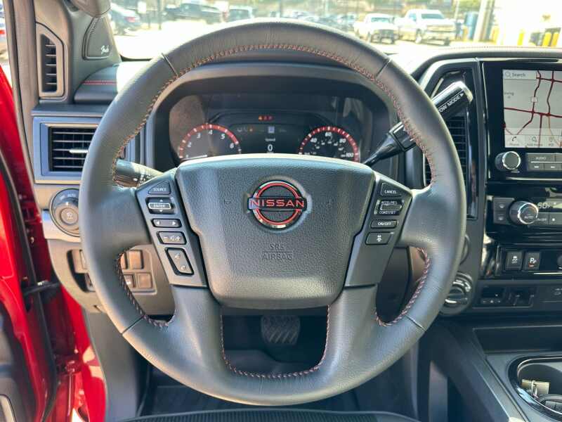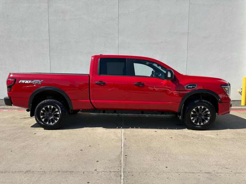 2024 Nissan Titan XD PRO-4X 5.6 Endurance V8 Red Alert 4D Crew Cab 4WD 9-Speed Automatic 5.6L V8 DOHC 32V Federal 400hp 12 Speakers, 4-Wheel Disc Brakes, 4.083 Axle Ratio, ABS brakes, Air Conditioning, Alloy wheels, AM/FM radio SiriusXM, Auto High-beam Headlights, Auto-dimming Rear-View mirror, Automatic temperature control, Blind Spot Warning, Brake assist, Compass, Delay-off headlights, Driver door bin, Driver vanity mirror, Dual front impact airbags, Dual front side impact airbags, Electronic Stability Control, Emergency communication system NissanConnect Services, Front anti-roll bar, Front Bucket Seats, Front Captain's Seats, Front Center Armrest, Front dual zone A/C, Front fog lights, Front reading lights, Front wheel independent suspension, Fully automatic headlights, Garage door transmitter HomeLink, Heated door mirrors, Illuminated entry, Illuminated Kick Plate - PRO-4X, Knee airbag, Leather steering wheel, Low tire pressure warning, Navigation system NissanConnect with Navigation and Services, Occupant sensing airbag, Off Road Protection Package (K94), Outside temperature display, Overhead airbag, Overhead console, Panic alarm, Passenger door bin, Passenger vanity mirror, Power door mirrors, Power driver seat, Power steering, Power windows, PRO-4X Mud Flaps, PRO-4X Rugged Step Boards, PRO-4X Style Cloth Seat Trim, Radio data system, Radio NissanConnect w/Navigation, Rain sensing wipers, Rear anti-roll bar, Rear Bumper Step & Electronic Tailgate Lock, Rear seat center armrest, Rear step bumper, Rear window defroster, Remote keyless entry, Security system, Speed control, Speed-sensing steering, Speed-Sensitive Wipers, Split folding rear seat, Standard on PRO-4X, Steering wheel mounted audio controls, Tachometer, Telescoping steering wheel, Tilt steering wheel, Traction control, Turn signal indicator mirrors, USB Charging Cables, Variably intermittent wipers, Voltmeter, Wheels 18 x 7.5 Painted Dark Finish Alloy.