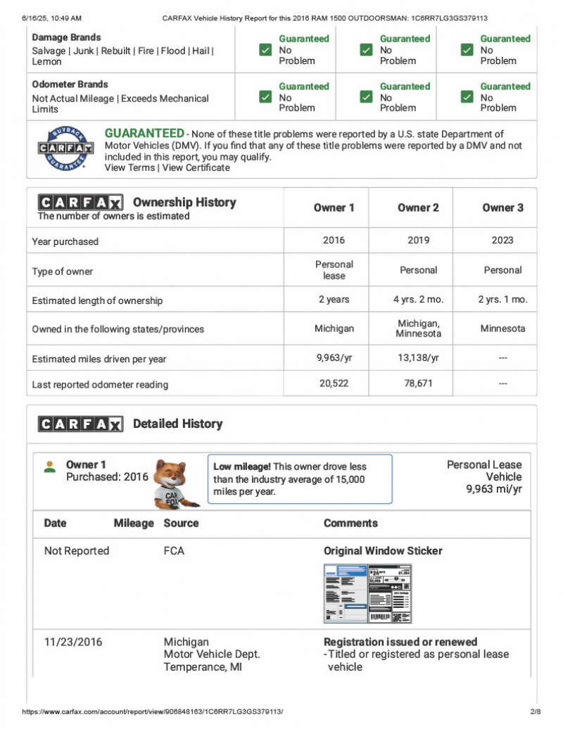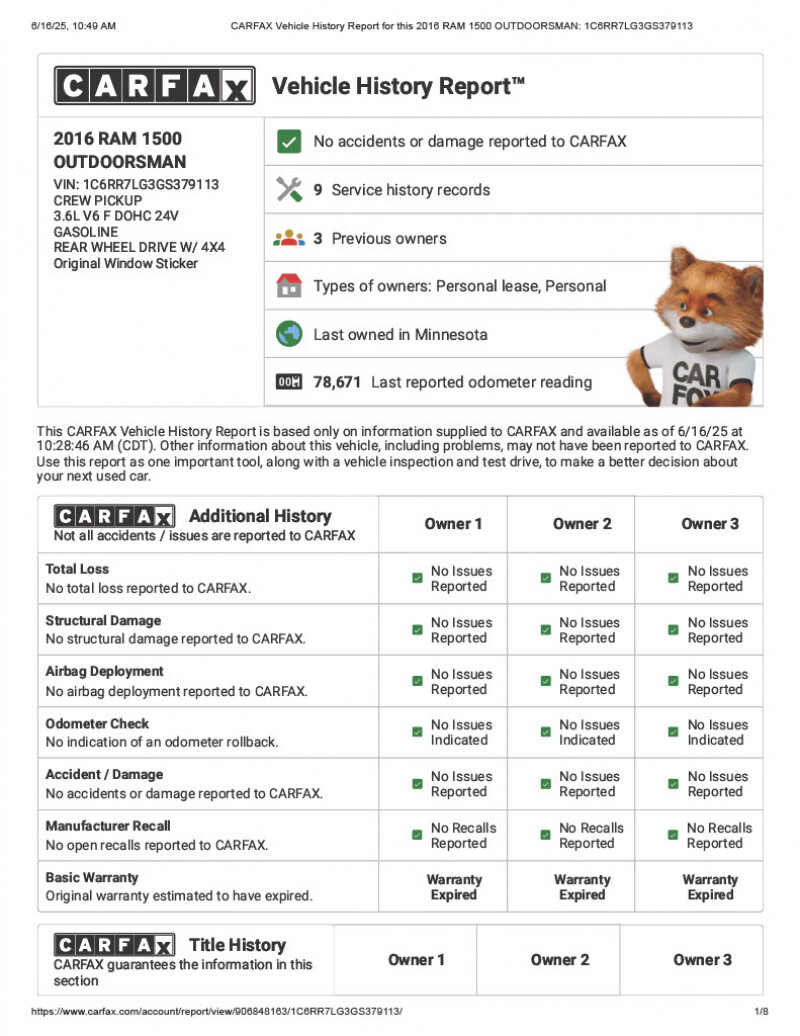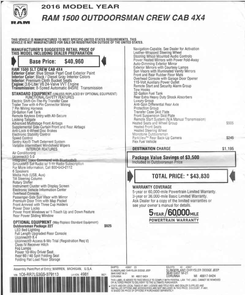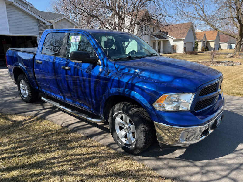 2016 RAM 1500 SLT Crew Cab 4x4 with Outdoorsman PackageBARGAIN PRICED - Well below actual valueGREAT OPTIONS FOR COLD MINNESOTA WINTERSLOW MILES VERY WELL EQUIPPED FOR TOWINGCAR FAX shows no collisions and excellent professional maintenance history Exterior Color Blue Streak PearlInterior Color Black / Diesel Gray3.6L Pentastar V6 Engine8 Speed Automatic Transmission5 8 Bed with Liner and Tonneau Cover97,000 MilesRemote Start 2 Key FOBSPower 10-way Driver SeatHeated Seats, Heated Steering Wheel, Heated Mirrors with Power Fold AwayTowing Package, Class IV 2 Receiver Hitch, 4 pin and 7 pin wiring connectRear seats fold down to make flat floor for cargoTonneau CoverBed LinerCurt Electric Trailer Brake ControlFront Tow HooksNew BF Goodrich All-Terrain T/A Raised White Letter Tires Recent Four Wheel Alignment New $250 Duralast Platinum Battery Jan 26, 2024The interior is in like new conditionFactory RAM floor mats front and back.License Plates good thru June 2026See Included Original Window Sticker for Additional DetailsLeave message at 6 five 1 2 one 9 3 four 6 8 and I will replywill consider reasonable offers