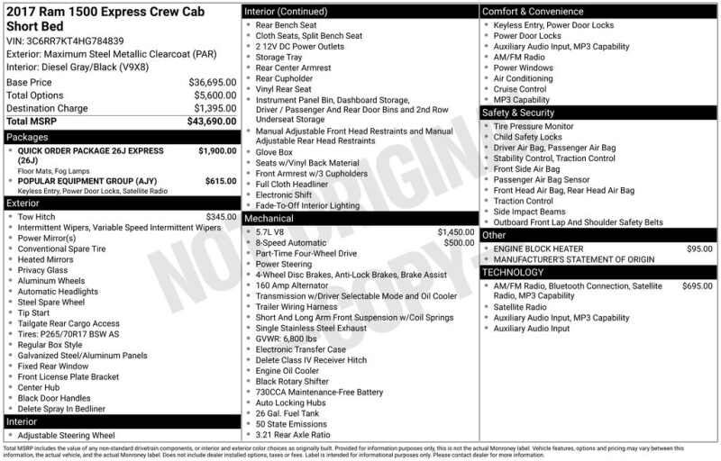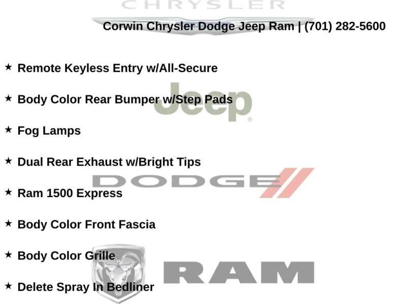 This Ram 1500 is well equipped and includes these key features and benefits, Touchscreen Controls, Backup Camera, Automatic Headlights, Bluetooth Handsfree, AWD / 4x4 / Four Wheel, 17 x 7 Aluminum Wheels, Body Color Front Fascia, Body Color Grille, Body Color Rear Bumper w/Step Pads, Carpet Floor Covering, Center Hub, Cloth 40/20/40 Bench Seat, Delete Class IV Receiver Hitch, Delete Spray In Bedliner, Dual Rear Exhaust w/Bright Tips, Fog Lamps, Front & Rear Floor Mats, Popular Equipment Group, Quick Order Package 26J Express, Ram 1500 Express, Remote Keyless Entry w/All-Secure, SIRIUSXM Satellite Radio.
