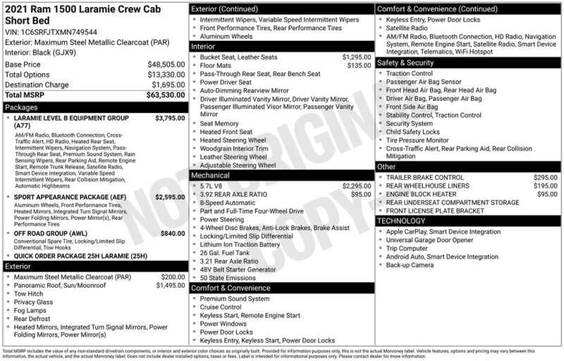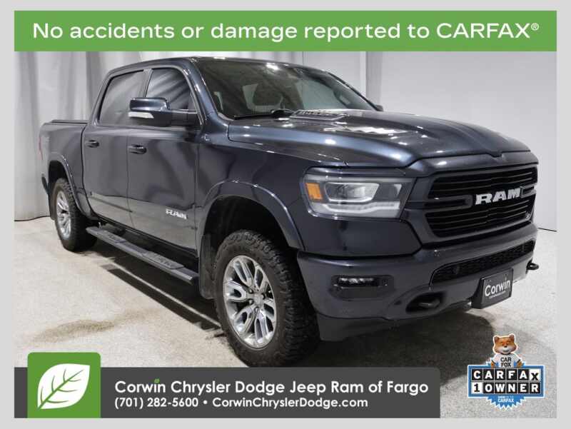 WELCOME TO DECEMBER AT CORWIN CHRYSLER DODGE JEEP RAM OF FARGO!! WE HAVE GREAT SAVINGS ON ALL OF OUR PRE-OWNED VEHICLES AVAILABLE!! WE HAVE ONE OF THE LARGEST SELECTION OF INVENTORIES IN OUR AREA AT ONE SINGLE LOCATION!! Recent Arrival! Priced below KBB Fair Purchase Price! Maximum Steel Metallic Clearcoat 2021 Ram 1500 Laramie 4D Crew Cab 4WD HEMI 5.7L V8 Multi Displacement VVT CARFAX One-Owner. Clean CARFAX.