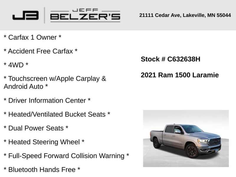 * Carfax 1 Owner * Accident Free Carfax * 4WD * 8.4-Inch Touchscreen w/Apple Carplay & Android Auto * Driver Information Center * Heated/Ventilated Bucket Seats * Dual Power Seats * Heated Steering Wheel * Full-Speed Forward Collision Warning * Bluetooth Hands Free * Cruise Control * Remote Start * 20 Inch Alloy Wheels * 9 Speaker Premium Audio w/Subwoofer * LED Tail Lamps * LED Fog Lamps * LED Headlamps * Auto High Beams * Rain Sensing Wipers * Push Button Start * Power Sliding Rear Window * Dual-Zone Automatic Climate Control * Rear Camera * Trailer Tow * Dual Exhaust * Satellite Radio *