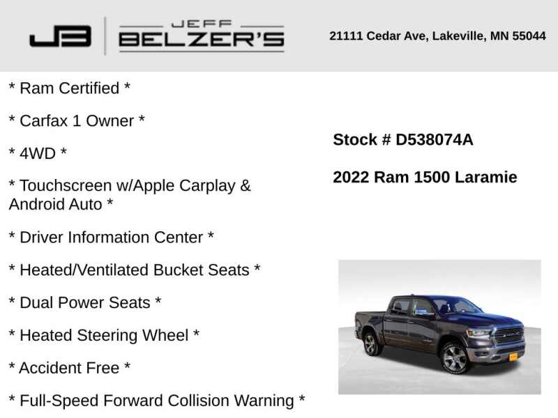 * Ram Certified * New Front Brake Rotors * Carfax 1 Owner * 4WD * 8.4-Inch Touchscreen w/Apple Carplay & Android Auto * Driver Information Center * Heated/Ventilated Bucket Seats * Dual Power Seats * Heated Steering Wheel * Accident Free * Full-Speed Forward Collision Warning * Bluetooth Hands Free * Cruise Control * Remote Proximity Keyless Entry * Remote Start * 20 Inch Alloy Wheels * 9 Speaker Premium Audio w/Subwoofer * LED Tail Lamps * LED Fog Lamps * LED Headlamps * Auto High Beams * Rain Sensing Wipers * Power Folding Outside Mirrors * Push Button Start * Power Sliding Rear Window * Dual-Zone Automatic Climate Control * Rear Camera * Trailer Tow * Integrated Trailer Brake Controller * Trailer Reverse Steering Control * Trailer Light Check * Satellite Radio *