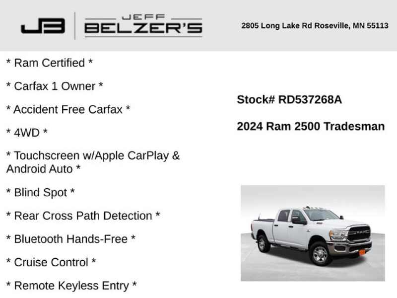* Four New Tires * Ram Certified * Carfax 1 Owner * Accident Free Carfax * 4WD * 8.4-Inch Touchscreen w/Apple CarPlay & Android Auto * Blind Spot * Rear Cross Path Detection * Bluetooth Hands-Free * Cruise Control * Remote Keyless Entry * Chrome Appearance * Trailer Tow Mirrors * Push Button Start * Power Sliding Rear Window * Rear Park Assist * Rear Camera * Trailer Tow * Integrated Trailer Brake Controller * 5th Wheel/Gooseneck Prep * Heavy-Duty Snow Plow Prep Package * Satellite Radio *