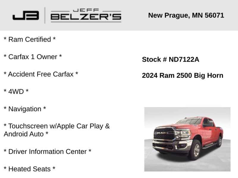 * Ram Certified * Carfax 1 Owner * Accident Free Carfax * 4WD * 12-Inch Navigation Touchscreen w/Apple Car Play & Android Auto * Driver Information Center * Heated Seats * Power Seat w/Power Lumbar * Heated Steering Wheel * Blind Spot * Rear Cross Path Detection * Lane Departure Warning * Lane Keep Assist * Autonomous Emergency Braking * Full-Speed Forward Collision Warning * Bluetooth Hands Free * Cruise Control * Remote Start * 18 Inch Alloy Wheels * 9 Speaker Premium Audio w/Subwoofer * Remote Keyless Entry * Push Button Start * Power Sliding Rear Window * Front and Rear Park Assist * Dual-Zone Automatic Climate Control * Rear Camera * Trailer Tow * Integrated Trailer Brake Controller * Spray-On Bedliner * LED Box Lighting * Satellite Radio *