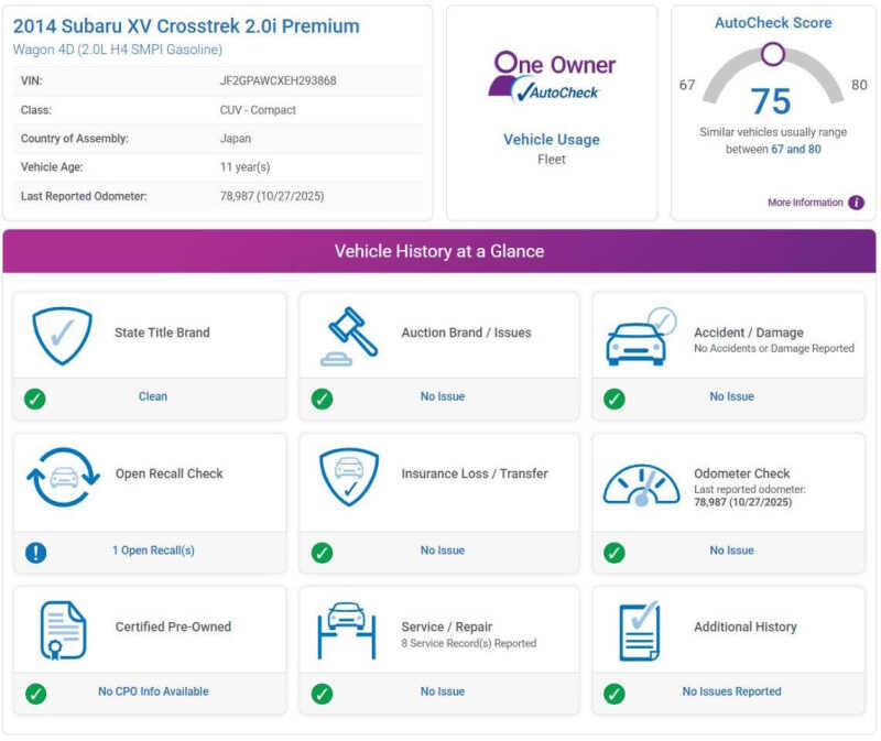 This vehicle is located at our Burnsville store. ONE OWNER!! CLEAN TITLE!! NO ACCIDENTS!! Looking for a ride thats adventurous and reliable. This 2014 Subaru XV Crosstrek 2.0i Premium is the perfect balance of rugged capability and everyday comfort. With Subarus legendary Symmetrical All-Wheel Drive and a fuel-efficient 2.0L BOXER engine, its ready to tackle snow, rain, dirt roads, and city streets with equal confidenceall while getting excellent gas mileage. The Premium trim means youre getting great features like heated front seats, a touchscreen infotainment system with Bluetooth connectivity, a backup camera, and sleek alloy wheels that make it stand out on any road. Its raised suspension gives you extra ground clearance for weekend adventures, yet it still handles smoothly and parks easily in town. With Subarus reputation for durability and safety, this Crosstrek is a smart buy that will keep you exploring for years to comedependable, versatile, and ready for whatevers next. Stop by RAVMOTORS to test drive this car. Well be more than happy to help you find the right car at the right price. We don't have any pushy or high-pressure salespeople. So come in and see for yourself why we have been the #1 DealerRater used car dealership of the year 5 years in a row. Extended Warranties and Financing options are available. Call us for vehicle availability at 952-456-4041 or email us at ravmotorsinfogmail.com. For more information and a full inventory visit us at www.ravmotors.com. We are open Monday Thursday 10 am 7 pm, Friday - Saturday 930 am 6 pm.
