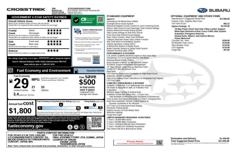 Available at our Crystal location, Unleash your adventurous side with the all-new 2025 Subaru Crosstrek Premium AWD, the perfect crossover for daily commuting and weekend exploration. Unlike the base model, the Premium is powered by the larger 2.5L SUBARU BOXER engine, delivering more responsive performance without sacrificing efficiency, still achieving an impressive 33 HWY MPG. You'll drive with confidence knowing that legendary Symmetrical All-Wheel Drive and generous 8.7 inches of ground clearance are standard, ready for any weather or trail. The Premium trim upgrades your experience with the large 11.6-inch STARLINK Multimedia Plus touchscreen and convenience features like Keyless Access and Push-Button Start. Equipped with Subaru's award-winning EyeSight Driver Assist Technology, your safety and peace of mind are always prioritized. This highly sought-after Crosstrek Premium offers the ideal balance of capability, technology, and value, its ready for you today! Come on down to RavMotors of Crystal to test-drive our cars! We'll be happy to help you find the right car at the right price. Call for vehicle availability at 763-401-4242 or email us at ravmotorsofcrystalgmail.com. Make sure to check out our inventory at www.ravmotors.com We stand behind all of our cars. We are open from 1000 AM - 700 PM on Monday-Thursday and 1000 AM - 600 PM on Friday-Saturday.