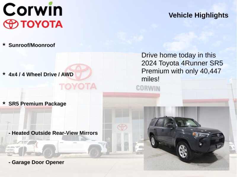 This Toyota 4Runner is well equipped and includes the following features and benefits, Sunroof/Moonroof, 4x4 / 4 Wheel Drive / AWD, Garage Door Opener, Heated front seats, Heated Outside Rear-View Mirrors, SofTex Seat Trim, SofTex-Trimmed 50/50 Split Fold-Flat 3rd Row, SR5 Premium Package, Trunk Carpet.