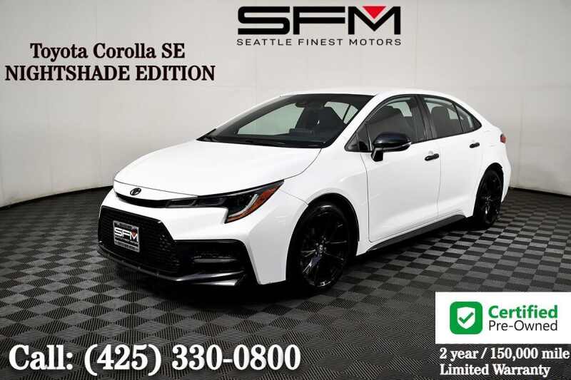 Roll up in style with our 2022 Toyota Corolla SE Sedan Nightshade Edition that turns heads in Super White. Motivated by a 2.0 Liter 4 Cylinder generating 169hp paired to a paddle-shifted CVT for engaging performance. This Front Wheel Drive sedan is also efficient enough to achieve nearly 40mpg on the highway, and it's bold enough to bring a smile to your face with blacked-out details, upgraded LED lighting, a sport-style mesh grille, prominent rocker panels, alloy wheels, and dual chrome-tipped exhaust outlets. Settle inside our SE Nightshade Edition cabin that treats you to all-day comfort with premium performance front seats, a leather-wrapped steering wheel, automatic climate control, and remote keyless entry. You'll also appreciate the digital convenience of an 8-inch touchscreen, WiFi compatibility, Apple CarPlay, Android Auto, Amazon Alexa compatibility, and Bluetooth. The six-speaker audio system can add your favorite soundtrack! Toyota Safety Sense technology takes care of you as you go with automatic braking, lane-departure alert, lane-keeping assistance, pedestrian detection, adaptive cruise control, and a backup camera. Our Corolla SE Nightshade Edition is a small car with a big attitude! Save this Page and Call for Availability. We Know You Will Enjoy Your Seattle Finest Motors Test Drive Towards Ownership! . All prices are exclusive of government fees and taxes, finance charges, dealer documentation fees, and any emission testing charges. A theft recovery device is installed in all our vehicles, and there is an additional cost for this feature. The interior/exterior protection plan is applied to some of our vehicles, and additional fees will apply. The listed price for vehicles does not include additional charges such as license, title, registration fees, state or local taxes, smog fees, credit investigation fees, optional credit insurance, physical damage or liability insurance, or delivery fees. While we try to make sure that all prices posted here are accurate at all times, we cannot be responsible for typographical and other errors, Including those related to the vehicle option list that may appear on the site.We strongly recommend verifying all details indepently. We make every effort to provide you the most accurate, up-to-the-minute information however it is your responsibility to verify with the Dealer that all details listed are accurate. We are not responsible for the accuracy of information reported by third-party platforms like Carfax or Autocheck. Please be aware that advertised prices and available quantities are subject to change without notice. All rates and offers are dependent on bank approval, which can vary based on your credit and the vehicle. . Advertised prices and available quantities are subject to change without notice. All rates and offers are dependent on bank approval, which varies based on applicant's credit as well as the vehicle.