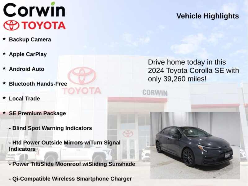 This Toyota Corolla is well equipped and includes the following features and benefits, Backup Camera, Apple CarPlay, Android Auto, Bluetooth Hands-Free, Local Trade, Blind Spot Warning Indicators, Htd Power Outside Mirrors w/Turn Signal Indicators, Power Tilt/Slide Moonroof w/Sliding Sunshade, Qi-Compatible Wireless Smartphone Charger, SE Premium Package. 31/40 City/Highway MPG