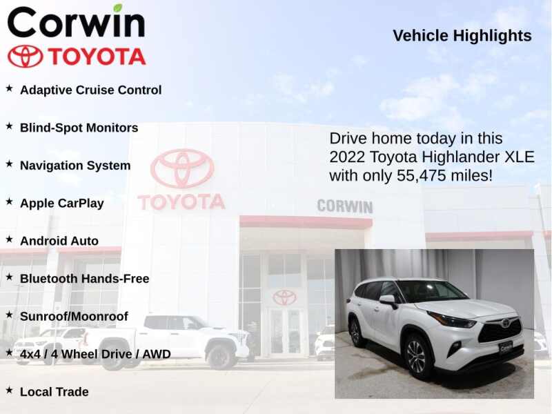 This Toyota Highlander is well equipped and includes the following features and benefits, Adaptive Cruise Control, Blind-Spot Monitors, Navigation System, Apple CarPlay, Android Auto, Bluetooth Hands-Free, Sunroof/Moonroof, 4x4 / 4 Wheel Drive / AWD, Local Trade, 2nd Row Bench Seat, Power Liftgate. 20/27 City/Highway MPG