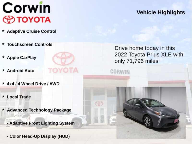 This Toyota Prius is well equipped and includes the following features and benefits, Adaptive Cruise Control, Touchscreen Controls, Apple CarPlay, Android Auto, 4x4 / 4 Wheel Drive / AWD, Local Trade, Adaptive Front Lighting System, Advanced Technology Package, Color Head-Up Display (HUD). 51/47 City/Highway MPG