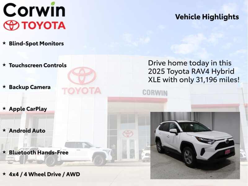 This Toyota RAV4 Hybrid is well equipped and includes the following features and benefits, Blind-Spot Monitors, Touchscreen Controls, Backup Camera, Apple CarPlay, Android Auto, Bluetooth Hands-Free, 4x4 / 4 Wheel Drive / AWD. 41/38 City/Highway MPG