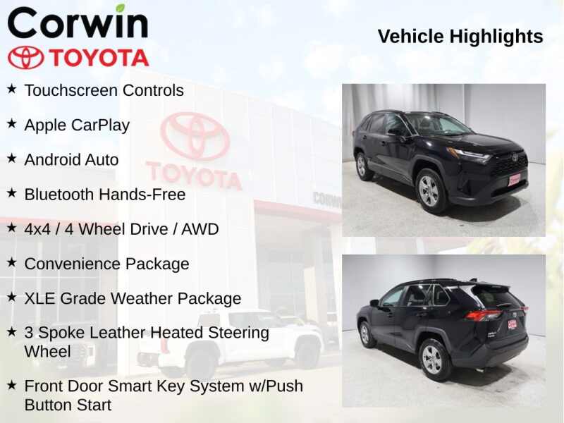 This Toyota RAV4 is well equipped and includes the following features and benefits, Touchscreen Controls, Apple CarPlay, Android Auto, Bluetooth Hands-Free, 4x4 / 4 Wheel Drive / AWD, 3 Spoke Leather Heated Steering Wheel, Convenience Package, Front Door Smart Key System w/Push Button Start, Front Seat Heating, Rain Sensing Front Wipers, Tilt & Slide Moon Roof, XLE Grade Weather Package. Odometer is 24313 miles below market average! 27/33 City/Highway MPG