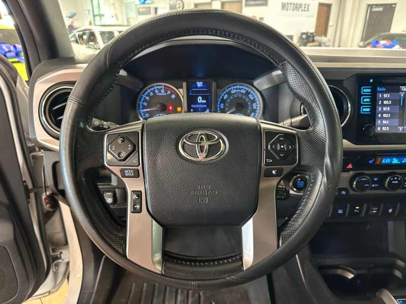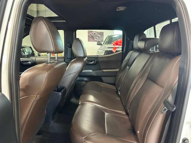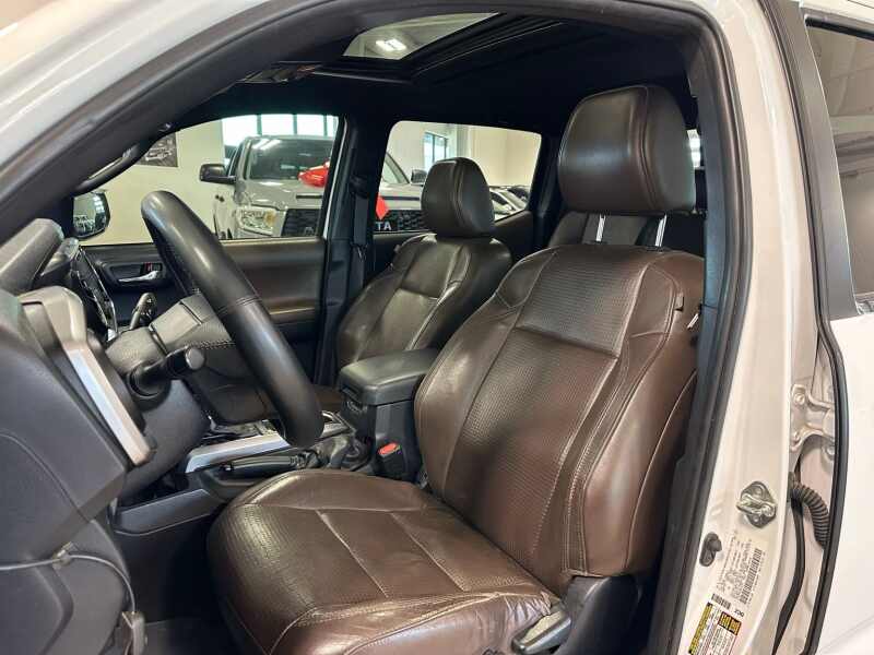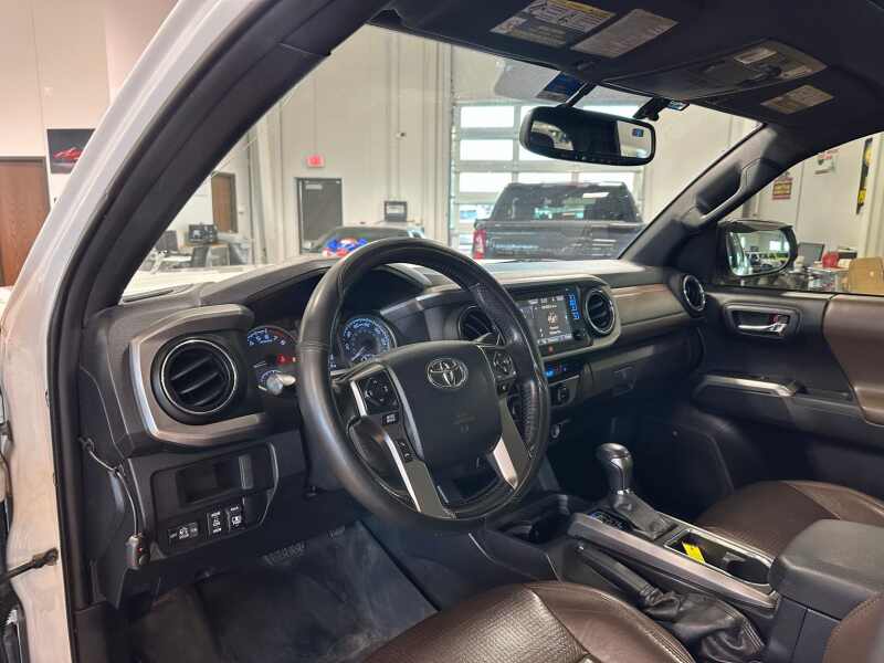 2017 Toyota Tacoma Limited V6 4x4 Premium Leather, Power Sunroof, Super White 4D Double Cab 4WD 6-Speed Automatic V6 4WD, 7 Speakers, ABS brakes, Air Conditioning, Alloy wheels, AM/FM radio SiriusXM, Anti-whiplash front head restraints, Auto-dimming Rear-View mirror, Automatic temperature control, Axle Ratio 3.91, Brake assist, Bumpers body-color, CD player, Compass, Driver door bin, Driver vanity mirror, Dual front impact airbags, Dual front side impact airbags, Electronic Stability Control, Entune App Suite, Exterior Parking Camera Rear, Front anti-roll bar, Front Bucket Seats, Front Center Armrest, Front dual zone A/C, Front fog lights, Front reading lights, Front wheel independent suspension, Garage door transmitter HomeLink, Illuminated entry, Knee airbag, Leather Seat Trim, Leather Shift Knob, Low tire pressure warning, Navigation System, Occupant sensing airbag, Outside temperature display, Overhead airbag, Overhead console, Panic alarm, Passenger door bin, Passenger vanity mirror, Power door mirrors, Power moonroof, Power steering, Power windows, Radio Entune Premium JBL AM/FM/CD w/Nav & App Ste, Rear Parking Sensors, Rear step bumper, Remote keyless entry, Security system, Speed control, Speed-sensing steering, Split folding rear seat, Steering wheel mounted audio controls, Tachometer, Telescoping steering wheel, Tilt steering wheel, Traction control, Trip computer, Turn signal indicator mirrors, Variably intermittent wipers, Wheels 18 x 7.5 Polished Alloy.