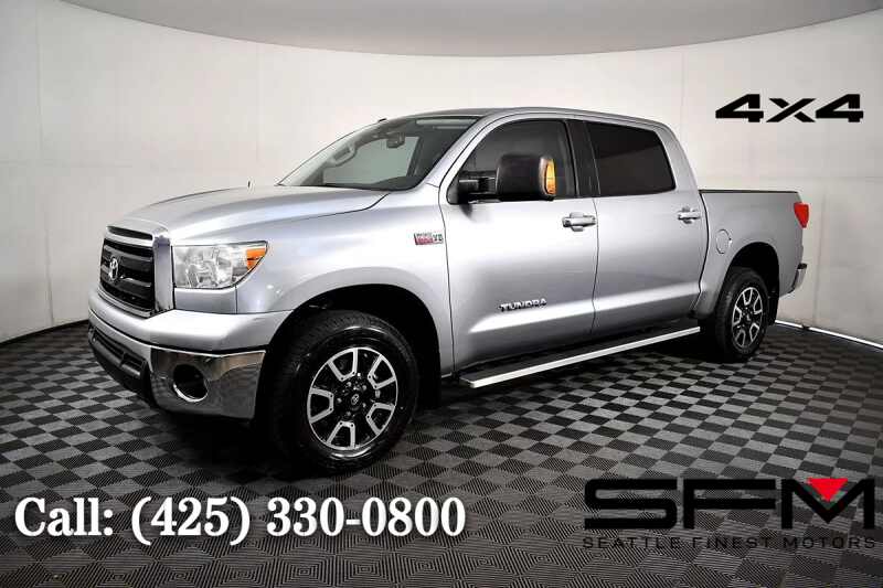 You'll stay confidently in command in our 2013 Toyota Tundra CrewMax 4X4 decked out in Silver Sky Metallic. Powered by a 5.7 Liter iForce V8 that offers 381hp tied to a 5 Speed Automatic transmission for plenty of pulling power. The sound of this Four Wheel Drive team will get your blood pumping and provide you with up to 18mpg on the road with acceleration that would put some sports sedans to shame! Our Tundra has toughness, strength, and style to spare. Chrome bumpers, running boards, bedliner, and prominent wheels highlight the great-looking exterior. Notice practical controls, a power vertical-sliding rear window, sliding reclining seats, and a fold-flat back seat in our Tundra. Full power accessories and cruise control work hard to make this a great work vehicle and an equally excellent family machine. Our Toyota Tundra leads the pack in safety thanks to intelligently designed ABS, stability/traction control, trailer sway control, and numerous airbags. Get behind the wheel and experience the best of both worlds with this stylish Tundra workhorse. Save this Page and Call for Availability. We Know You Will Enjoy Your Seattle Finest Motors Test Drive Towards Ownership! . All prices are exclusive of government fees and taxes, finance charges, dealer documentation fees, and any emission testing charges. A theft recovery device is installed in all our vehicles, and there is an additional cost for this feature. The interior/exterior protection plan is applied to some of our vehicles, and additional fees will apply. The listed price for vehicles does not include additional charges such as license, title, registration fees, state or local taxes, smog fees, credit investigation fees, optional credit insurance, physical damage or liability insurance, or delivery fees. While we try to make sure that all prices posted here are accurate at all times, we cannot be responsible for typographical and other errors, Including those related to the vehicle option list that may appear on the site.We strongly recommend verifying all details indepently. We make every effort to provide you the most accurate, up-to-the-minute information however it is your responsibility to verify with the Dealer that all details listed are accurate. We are not responsible for the accuracy of information reported by third-party platforms like Carfax or Autocheck. Please be aware that advertised prices and available quantities are subject to change without notice. All rates and offers are dependent on bank approval, which can vary based on your credit and the vehicle. . Advertised prices and available quantities are subject to change without notice. All rates and offers are dependent on bank approval, which varies based on applicant's credit as well as the vehicle.