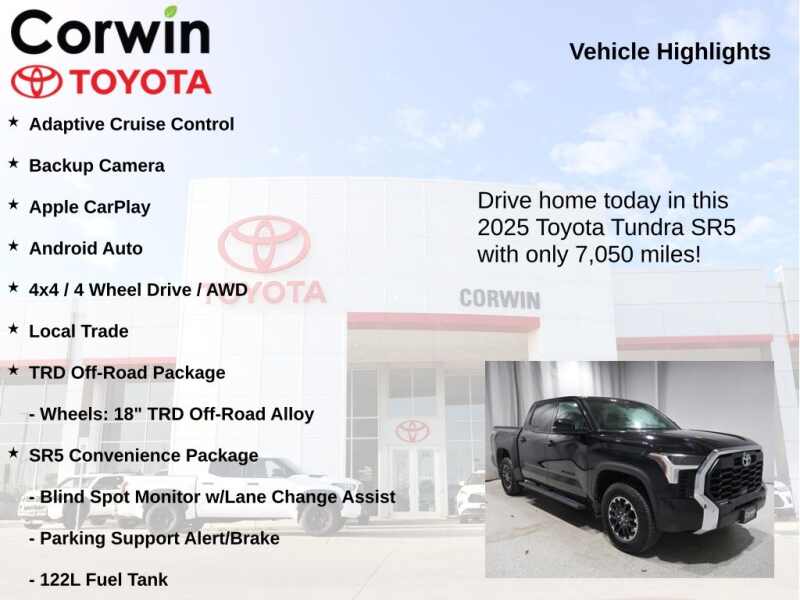 This Toyota Tundra is well equipped and includes the following features and benefits, Adaptive Cruise Control, Backup Camera, Apple CarPlay, Android Auto, 4x4 / 4 Wheel Drive / AWD, Local Trade, 122L Fuel Tank, Blind Spot Monitor w/Lane Change Assist, Parking Support Alert/Brake, SR5 Convenience Package, TRD Off-Road Package, Wheels 18 TRD Off-Road Alloy. Odometer is 1143 miles below market average!