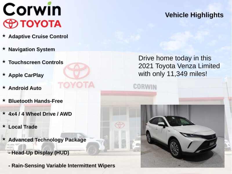 This Toyota Venza is well equipped and includes the following features and benefits, Adaptive Cruise Control, Navigation System, Touchscreen Controls, Apple CarPlay, Android Auto, Bluetooth Hands-Free, 4x4 / 4 Wheel Drive / AWD, Local Trade, ABS brakes, Active Cruise Control, Advanced Technology Package, Alloy wheels, Electronic Stability Control, Front dual zone A/C, Head-Up Display (HUD), Heated & Ventilated Front Bucket Seats, Heated front seats, Illuminated entry, Low tire pressure warning, Navigation System, Power Liftgate, Rain-Sensing Variable Intermittent Wipers, Remote keyless entry, Star Gaze Fixed Panoramic Roof, Traction control. Odometer is 55458 miles below market average! 40/37 City/Highway MPG