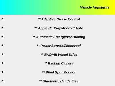 Description: Recent Arrival! POWER WINDOWS AND LOCKS*, CARPLAY/ ANDROID AUTO*, BLUETOOTH*, PRE-CERTIFIED**, NON-SMOKER*, AWD*, ONE OWNER*, CLEAN CARFAX*, PANORAMIC SUNROOF*, BACKUP CAMERA*, BLINDSPOT*, FORWARD COLLISION WARNING*, LOW MILES*, HEATED SEATS*, HEATED STEERING WHEEL*, REMOTE START*, 8.8 NAVIGATION SCREEN*, PREMIUM LIGHTING*, PREMIUM SOUND*, 14 Speak...Features:- - Navigation System