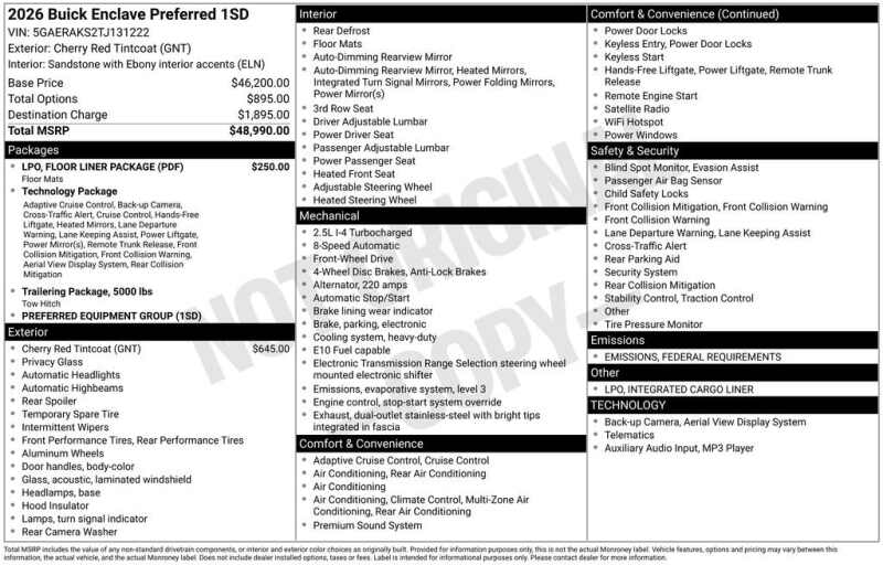 Description: Cherry Red Tintcoat 2026 Buick Enclave Preferred AWD 8-Speed Automatic 2.5L DOHC AWD.Features:- - Preferred Equipment Group 1SD