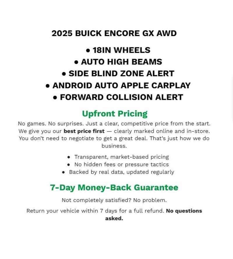 Description: 2025 Buick Encore GX Preferred Summit White AWD ECOTEC 1.3L Turbo2 USB Ports (1 Type-A, 1 Type-C), 3.17 Final Drive Axle Ratio, 4-Way Manual Passenger Seat Adjuster, 4-Wheel Disc Brakes, 6-Way Manual Driver Seat Adjuster, 7 Speakers, ABS brakes, Air Conditioning, Alloy wheels, AM/FM radio SiriusXM, Auto High-beam Headlights, Automatic temperature c...Features:- - Preferred Equipment Group 1SB