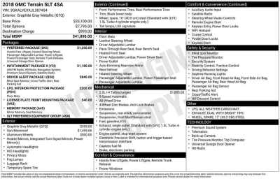 Description: Certified. 2018 GMC Terrain SLT Graphite Gray Metallic 4D Sport Utility AWD 9-Speed Automatic 2.0L TurbochargedCarBravo Certified, **NICE CARE** Warranty on Brake Pads, Tires, Belts, Battery, Bulbs, Hoses, Spark Plugs and Wiper Bl, Back-up Camera, Remote Start, Super Clean, Low Mileage, Clean CarFax, CarBravo GM Certified Certified, 2.0L Turbocharg...1- Sale Price: $21,345