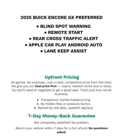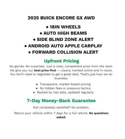 Description: 2025 Buick Encore GX Preferred Summit White AWD ECOTEC 1.3L Turbo2 USB Ports (1 Type-A, 1 Type-C), 3.17 Final Drive Axle Ratio, 4-Way Manual Passenger Seat Adjuster, 4-Wheel Disc Brakes, 6-Way Manual Driver Seat Adjuster, 7 Speakers, ABS brakes, Air Conditioning, Alloy wheels, AM/FM radio SiriusXM, Auto High-beam Headlights, Automatic temperature c...Features:- - Preferred Equipment Group 1SB