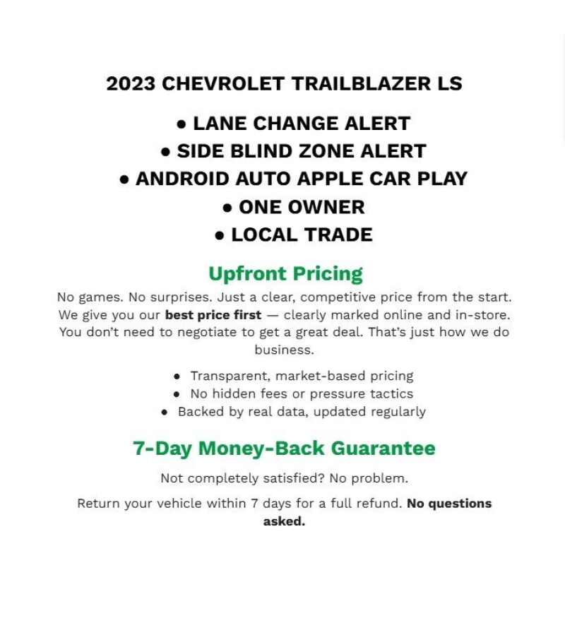 Description: Recent Arrival! 2023 Chevrolet TrailBlazer LS Mosaic Black Metallic FWD 1.2L Ecotec Turbo DOHC DI w/VVTLOCAL TRADE IN, ALUMINUM WHEELS, CLOTH, ANDROID AUTO & APPLE PLAY, BLUETOOTH(R) CONNECTION, NAVIGATION/GPS/NAVI, ONSTAR EQUIPPED, SIRIUS XM SATELLITE RADIO, WI FI HOT SPOT, REAR BACKUP CAMERA, REMAINING FACTORY WARRANTY, POWER MIRRORS, TRACTION CO...Features:- - Preferred Equipment Group 1LS