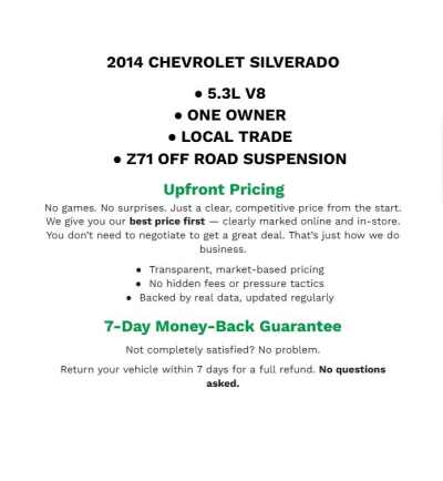 Description: Recent Arrival! 2014 Chevrolet Silverado 1500 LT LT2 Deep Ruby Metallic 4WD EcoTec3 5.3L V8 Flex FuelLOCAL TRADE IN, 4-WHEEL DRIVE, 10-Way Power Driver's Seat Adjuster, 110-Volt AC Power Outlet, 150 Amp Alternator, 3.42 Rear Axle Ratio, 4-Wheel Disc Brakes, 4.2 Diagonal Color Display Driver Info Center, 40/20/40 Front Split Bench Seat, 6 Speaker Au...Features:- - All Star Edition