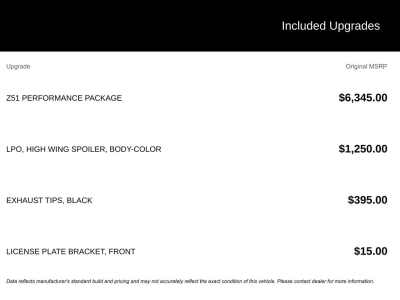 Description: 2LT Pkg, Navigation, Body Color Removable Roof, Leather, Heated & Ventilated Front Seats, Heated Steering Wheel, Head Up Display, BLIS, Lane Keep Assist, BOSE Performance Audio, Apple CarPlay, Android Auto, 19 & 20 Carbon Painted Alloy Wheels, Remote Start, GT2 Bucket Seats, Performance Exhaust, Front Lift Adjustable Height w/Memory, Rear Parking ...Features:- - Navigation System