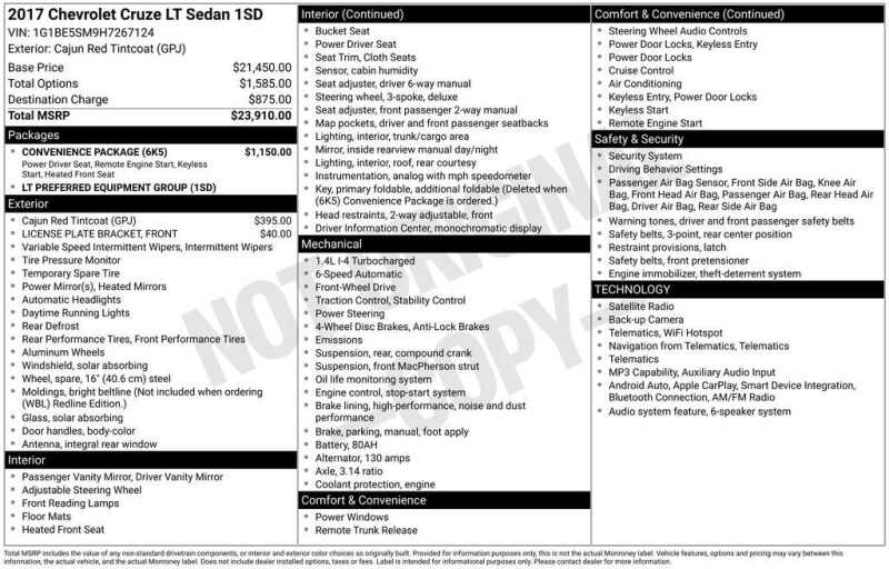 Description: Recent Arrival! 2017 Chevrolet Cruze LT Cajun Red Tintcoat 4D Sedan FWD 6-Speed Automatic 1.4L 4-Cylinder Turbo DOHC CVVT16 Aluminum Wheels, 4-Wheel Disc Brakes, 6 Speaker Audio System Feature, 6 Speakers, ABS brakes, Air Conditioning, Alloy wheels, AM/FM radio SiriusXM, Apple CarPlay/Android Auto, Brake assist, Bumpers body-color, Cloth Seat Trim,...1- Sale Price: $11,530