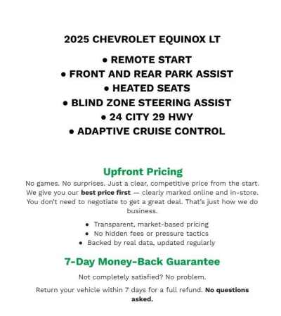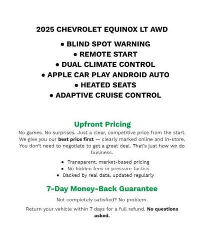 Description: Recent Arrival! Priced below KBB Fair Purchase Price! 2025 Chevrolet Equinox LT Mosaic Black Metallic AWD 1.5L DOHCCLEAN VEHICLE HISTORY REPORT, CLOTH, POWER DRIVER SEAT, HEATED FRONT SEATS, ANDROID AUTO & APPLE PLAY, BLUETOOTH(R) CONNECTION, ONSTAR EQUIPPED, SIRIUS XM SATELLITE RADIO, WI FI HOT SPOT, REAR BACKUP CAMERA, ALL WHEEL DRIVE, PUSH BUTTO...Features:- - Navigation System