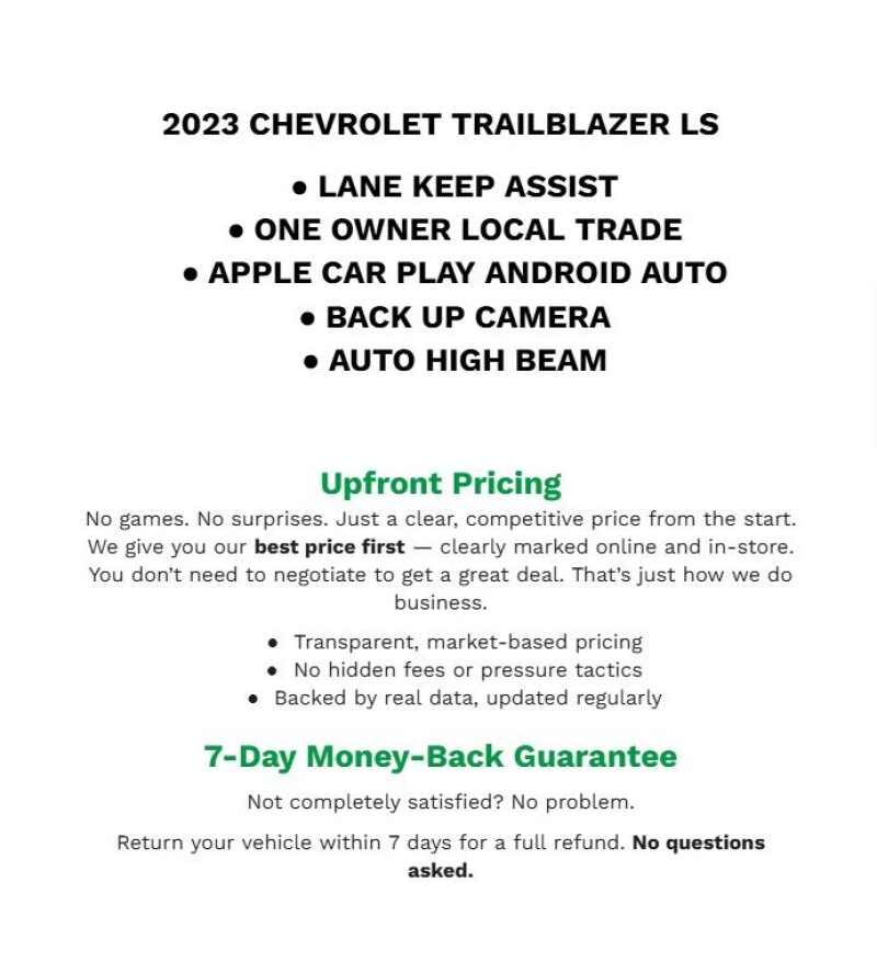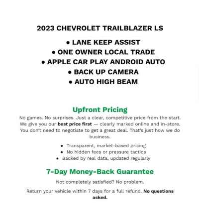 Description: Recent Arrival! Priced below KBB Fair Purchase Price! 2023 Chevrolet TrailBlazer LT Summit White FWD 1.2L Ecotec Turbo DOHC DI w/VVTLOCAL TRADE IN, ALUMINUM WHEELS, CLOTH, POWER DRIVER SEAT, HEATED FRONT SEATS, ANDROID AUTO & APPLE PLAY, BLUETOOTH(R) CONNECTION, SIRIUS XM SATELLITE RADIO, REAR BACKUP CAMERA, REMAINING FACTORY WARRANTY, POWER MIRROR...Features:- - Preferred Equipment Group 1LT