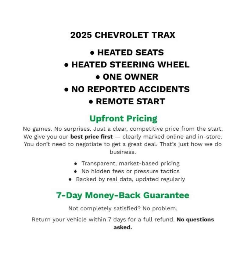 Description: 2025 Chevrolet Trax LT Summit White FWD 1.2L I3 DI Turbocharged DOHC 12V LEV3-ULEV70 137hp2-Way Adjustable Front Head Restraints, 3.50 Final Drive Axle Ratio, 4-Way Manual Front Passenger Seat Adjuster, 4-Wheel Disc Brakes, 6 Speakers, 6-Speaker Audio System Feature, 6-Way Manual Driver Seat Adjuster, ABS brakes, Air Conditioning, Alloy wheels, AM/...Features:- - License Plate Front Mounting Package