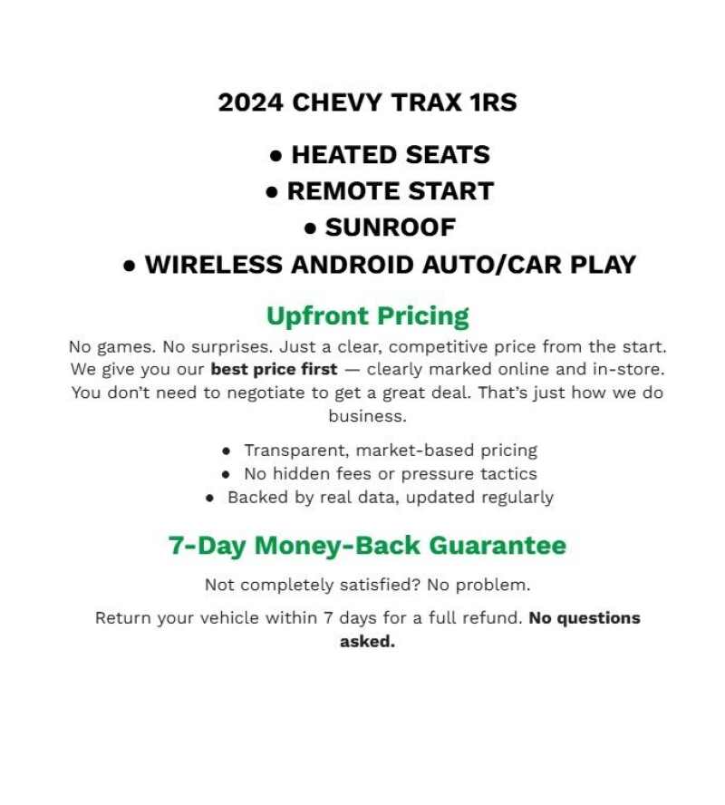 Description: Priced below KBB Fair Purchase Price! 2024 Chevrolet Trax LS Clean CARFAX. Crimson Metallic FWD 1.2L Ecotec Turbo DOHC DI w/VVT 28/32 City/Highway MPG Bergstrom Hyundai of Green Bay wants to buy your vehicle - even if you don't buy ours. Get your free and quick offer to purchase. To get our top dollar offer, call our Bergstrom Buying Team Hotline a...0- Sale Price: $17,979