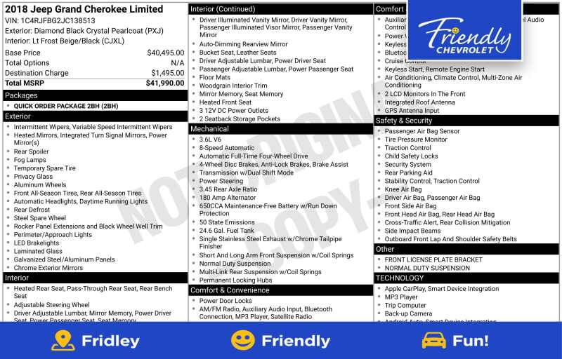 Description: Recent Arrival! 2018 Jeep Grand Cherokee Limited Diamond Black Crystal Pearlcoat 4D Sport Utility 4WD 8-Speed Automatic 3.6L V6 24V VVTBargain Lot Vehicle, Super Clean, Clean CarFax, 3.6L V6 24V VVT, 4WD, Black Leather, 3.45 Rear Axle Ratio, 4-Wheel Disc Brakes, 6 Speakers, ABS brakes, Air Conditioning, Alloy wheels, AM/FM radio SiriusXM, Anti-whip...Features:- - ENGINE 3.6L V6 24V VVT UPG I W/ESS (STD)