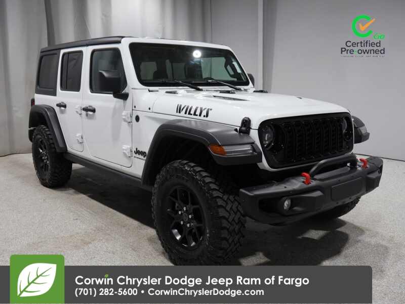 Description: HAPPY FALL AT CORWIN CHRYSLER DODGE JEEP RAM OF FARGO!! COME GOBBLE UP THE GREAT SAVINGS ON ALL OF OUR PRE-OWNED VEHICLES AVAILABLE!! WE HAVE ONE OF THE LARGEST SELECTIONS OF INVENTORIES IN OUR AREA AT ONE LOCATION!! Priced below KBB Fair Purchase Price! Bright White Clearcoat 2024 Jeep Wrangler Willys FACTORY CERTIFIED 4D Sport Utility 4WD 3.6L V6...Features:- - Quick Order Package 24W Willys