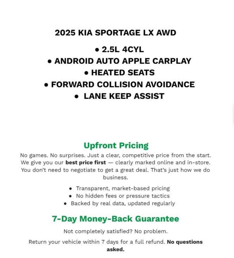 Description: Recent Arrival! 2025 Kia Sportage LX Ebony Black AWD I417 x 7.0J Alloy Wheels, 4-Wheel Disc Brakes, 6 Speakers, ABS brakes, Air Conditioning, Alloy wheels, AM/FM radio, Auto High-beam Headlights, Brake assist, Bumpers body-color, Carpeted Floor Mats, Cloth Seat Trim, Delay-off headlights, Driver door bin, Driver vanity mirror, Dual front impact air...Features:- - 17 IN x 7.0J Alloy Wheels