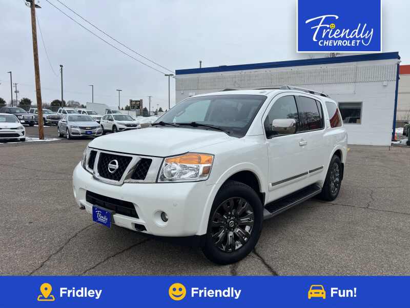 Description: 2015 Nissan Armada Platinum Pearl White 4D Sport Utility 4WD 5-Speed Automatic with Overdrive 5.6L 8-Cylinder SMPI DOHCBargain Lot Vehicle, Super Clean, Clean CarFax, Armada Platinum, 5.6L 8-Cylinder SMPI DOHC, 4WD, 12 Speakers, 20 6-Spoke Chrome Clad Wheels, 3.357 Axle Ratio, 3rd row seats split-bench, 4-Wheel Disc Brakes, A/V remote, ABS brakes, ...Features:- - ENGINE 5.6L DOHC 32V ENDURANCE V8 (STD)