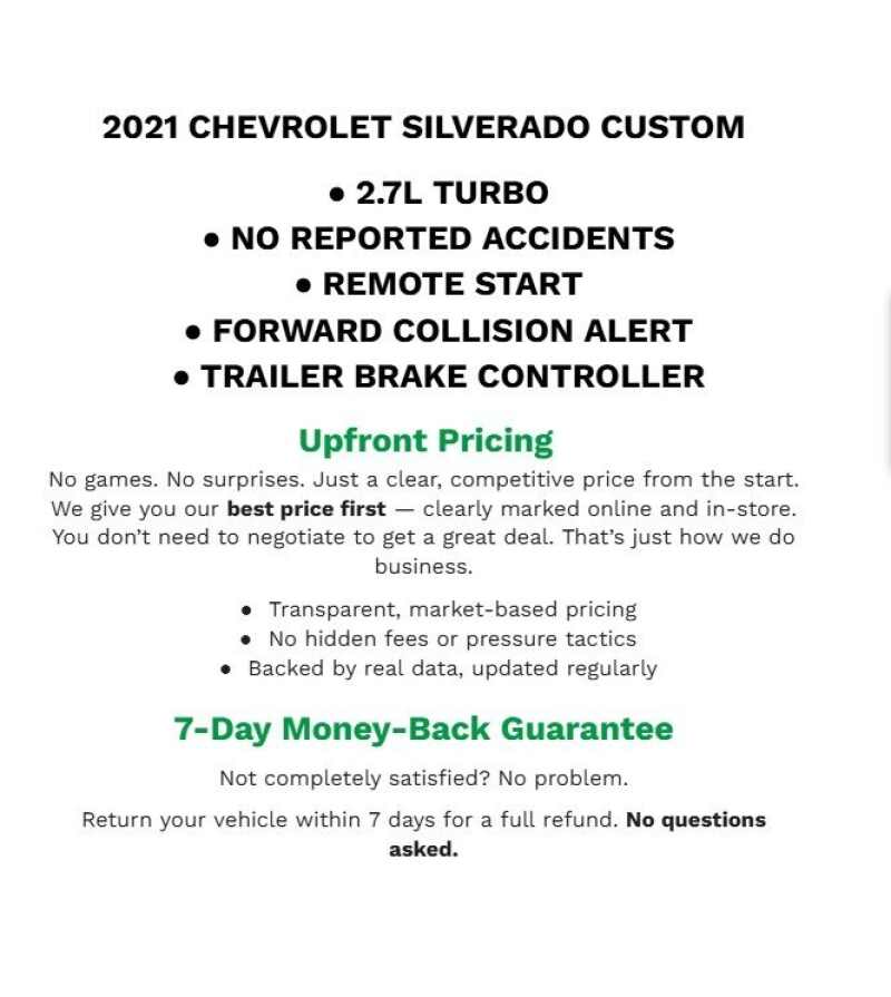 Description: Priced below KBB Fair Purchase Price! 2021 Chevrolet Silverado 1500 Custom 4WD 2.7L TurboLOCAL TRADE IN, CLOTH, BLUETOOTH(R) CONNECTION, ONSTAR EQUIPPED, REAR BACKUP CAMERA, 4-WHEEL DRIVE, 170 Amp Alternator, 3.42 Rear Axle Ratio, 3.5 Diagonal Monochromatic Display, 4-Wheel Disc Brakes, 40/20/40 Front Split Bench Seat, 4G LTE Wi-Fi Hot Spot Capable...Features:- - Custom Convenience Package